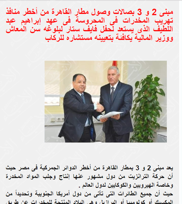 وهو نفسه الذى غادر منصب رئيس الإدارة المركزية لجمارك المطار فى 14 نوفمبر من الشهر الحالى منصبه لبلوغه سن المعاش كمكافئة له على فشله فى إدارة جمارك مطار القاهرة التى أصبحت من أكبر البؤر التهريبية لكل أنواع المُخدرات باهظة الثمن وكل ما خف وزنه وغلا ثمنه .