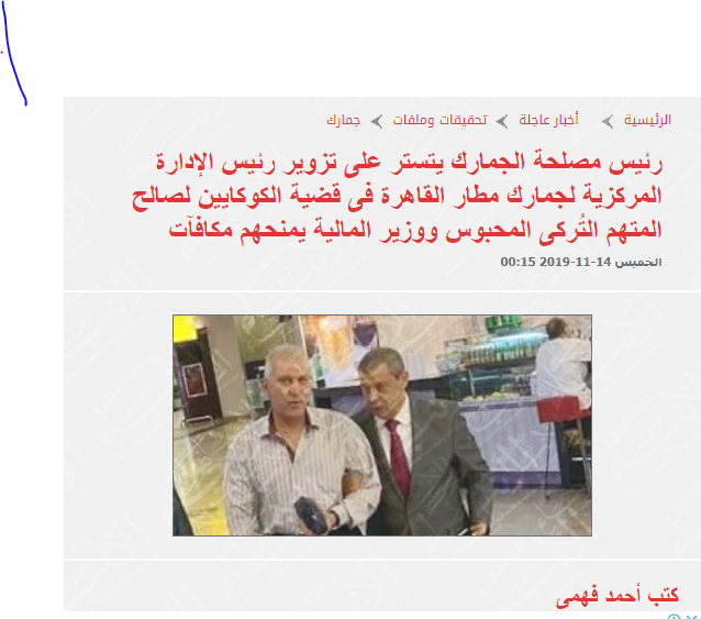 علامة إستفهام وراء تعيين المسئول الأول عن التلاعب بقضية كوكايين مطار القاهرة مستشاراً للركاب لـ يُدير جمارك المطار من الباطن فى سابقة هى الأولى فى تاريخ الجمارك بتعيين موظف بالمعاش بدرجة مدير عام مستشاراَ بوزارة المالية