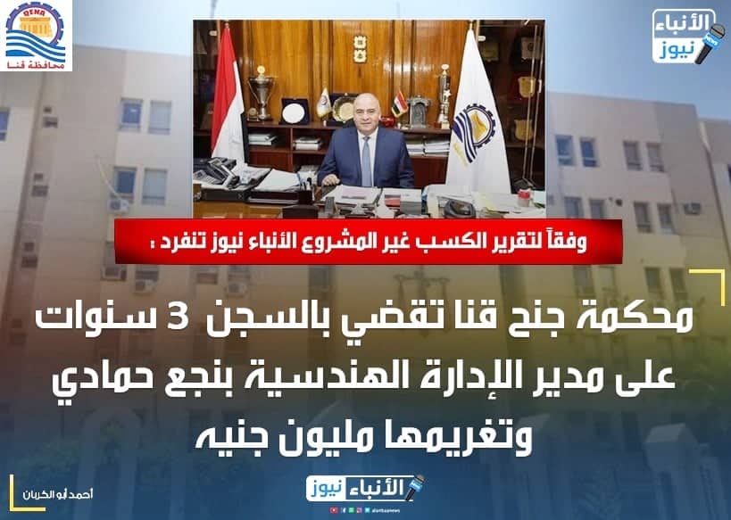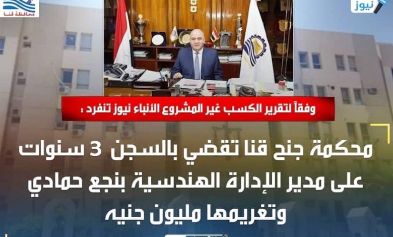 وفقاً لتقرير الكسب غير المشروع الأنباء نيوز تنفرد : محكمة جنح قنا تقضي بالسجن 3 سنوات على مدير الإدارة الهندسية بنجع حمادي وتغريمها مليون جنيه