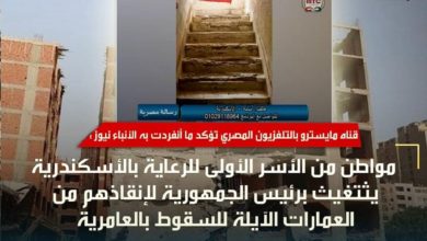 قناه مايسترو بالتلفزيون المصري تؤكد ما أنفردت به الأنباء نيوز : مواطن من الأسر الأولى للرعاية بالأسكندرية يثتغيث برئيس الجمهورية لإنقاذهم من العمارات الآيلة للسقوط بالعامرية