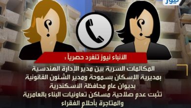 الأنباء نيوز تنفرد حصرياً : بتسريب مكالمات بين مدير الإدارة الهندسية بمديرية الإسكان بسموحة ومدير الشئون القانونية بديوان عام محافظة الأسكندرية تثبت عدم صلاحية مساكن تعاونيات البناء بالعامرية والمتاجرة بأحلام الفقراء