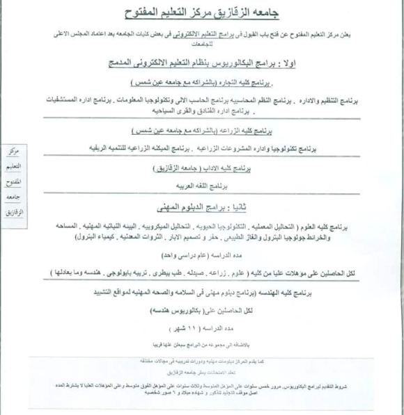 فتح باب القبول ببرامج التعليم المفتوح بجامعة الزقازيق