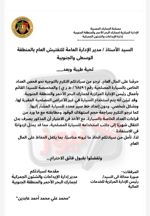 بل تم كشف المستور والمحظور التفتيش ورائها لدى إدارة التفتيش العام بالمنطقة الوسطى والجنوبية بمصلحة الجمارك، والذي كشف عنه الخطاب الموجه من محمد عابدين مدير آدارة الإيداعات والشؤون الجمركية لجمارك البحر الأحمر والمنطقة الجنوبية، بالتوجه نحو فحص العداد الخاص بسيارة مصلحة الجمارك الحكومية رقم (6849/ط ر ي).