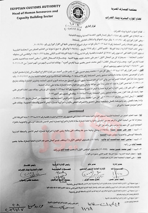 كشف القرار الإداري رقم 1508 الصادر في 25 ديسمبر 2025 من قطاع الموارد البشرية والذي كشف عن بعض مما خلف الأبواب المُغلقة بمصلحة الجمارك والخاص بالجزاء الموقع على رئيس الإدارة المركزية لجمارك البحر الأحمر ومدير عام جمرك سفاجا وآخرين.