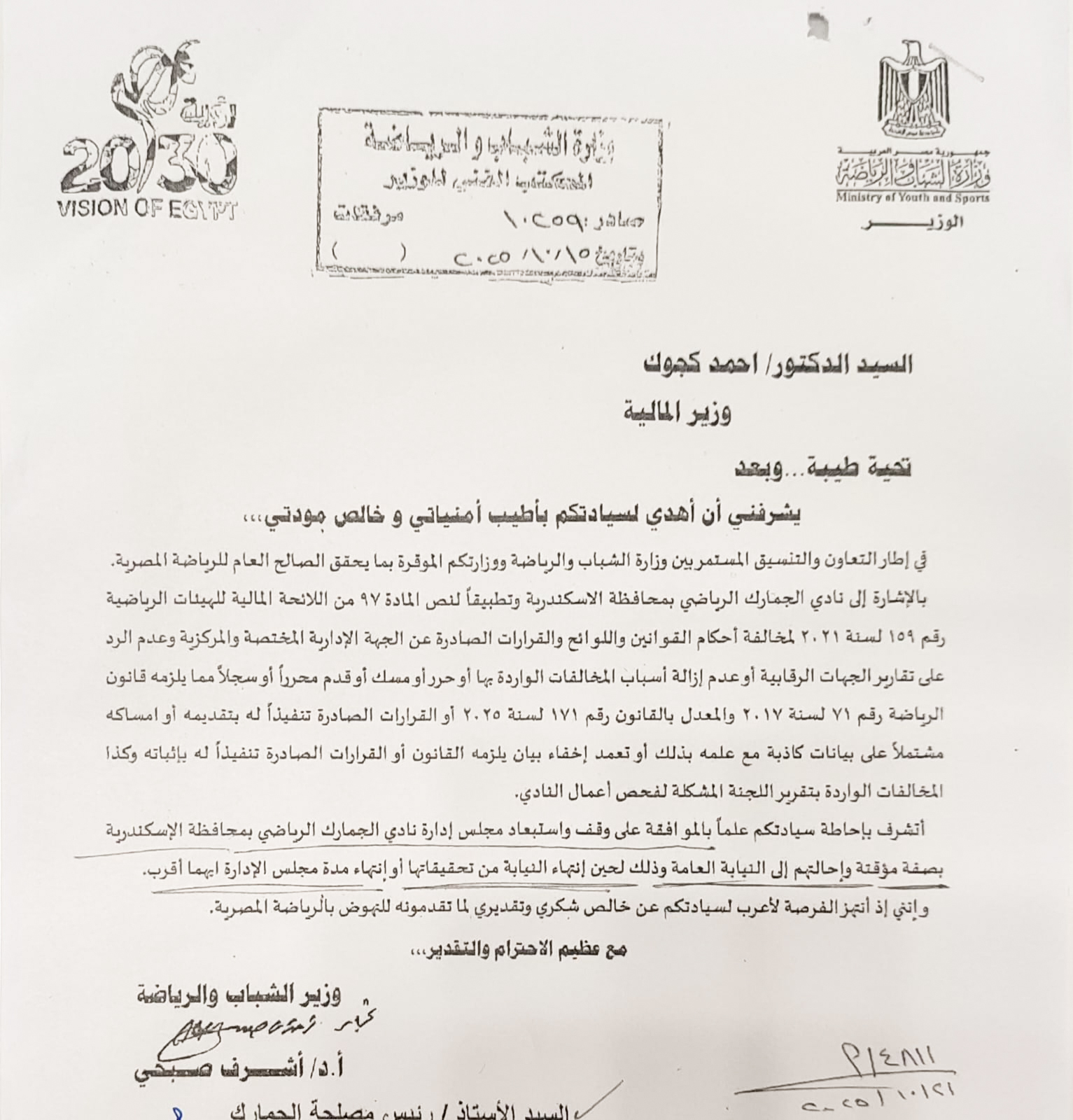 جاء ذلك في الخطاب الموجه من وزير الشباب والرياضة إلى وزير المالية برقم صادر 10259 لسنة 2025 .