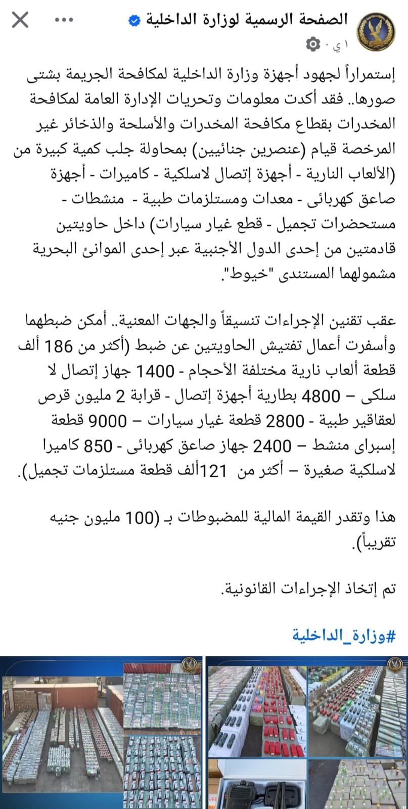 الصفحة الرسمية لوزارة الداخلية كشفت عن ضبط العربي وسامي (عنصرين جنائيين) قاموا بجلب مُنشطات جنسية وألعاب نارية وأجهزة لاسلكية وكاميرات تجسس بإخبارية لمكافحة المخدرات وصفحات الجمارك سارعت بنشر صور قيادتها بالسُخنة مع المضبوطات
