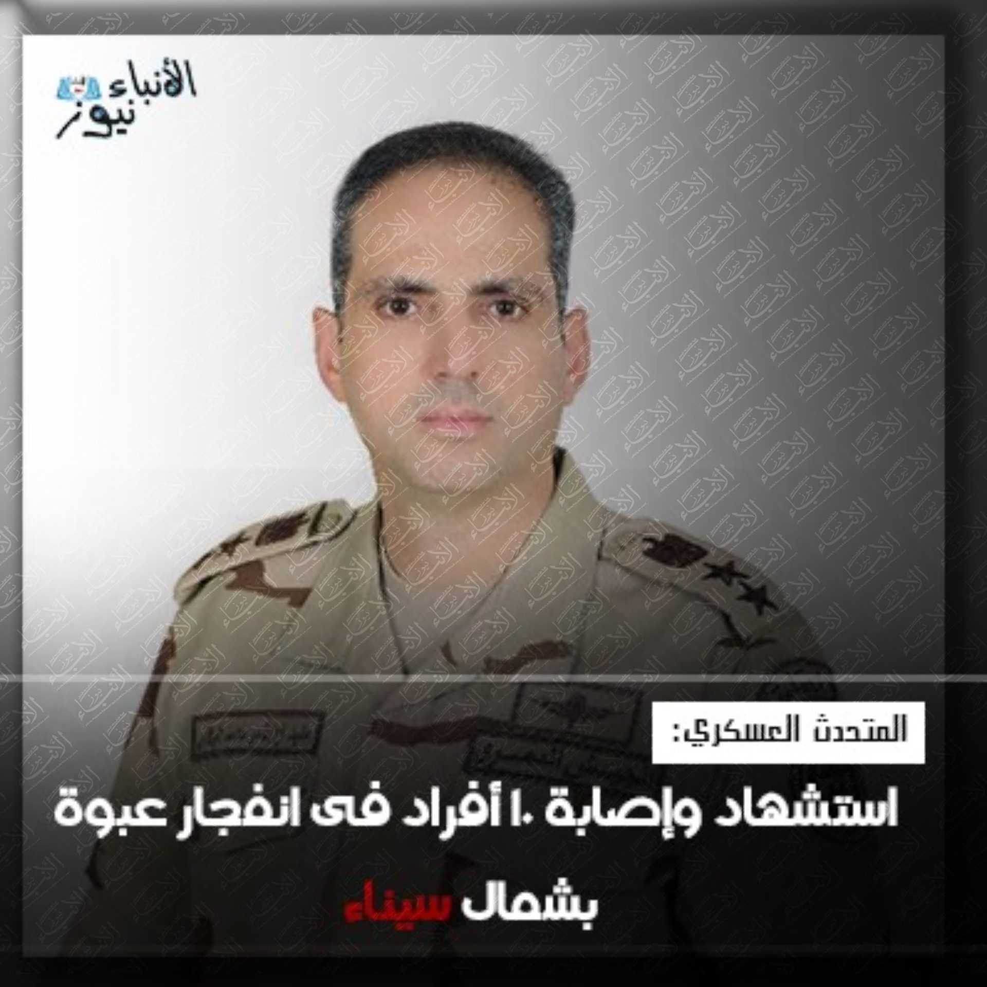أكد العقيد أركان حرب تامر الرفاعى، المتحدث العسكرى، انفجار عبوة ناسفة بأحد المركبات المدرعة جنوب مدينة بئر العبد نتج عنها استشهاد وإصابة ضابط وضابط صف و8 جنود، وتؤكد القوات المسلحة على استمرار أعمالها القتالية ضد العناصر الإرهابية للمحافظة على أمن الوطن واستقراره.
