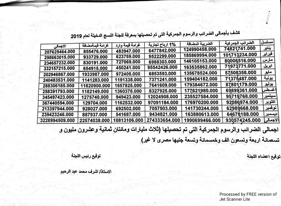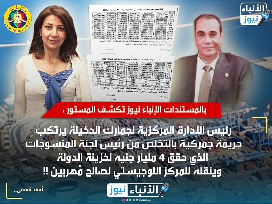 فيما كشفت باقي المُستندات التي بحوزة الأنباء نيوز عن فضيحة نقل رئيس لجنة المنسوجات بميناء الدخيلة و((المعروف بكفاءته في منصبه من القيادات الكبيرة لمصلحة الجمارك)) حيث كشف ((إجمالي الضرائب والرسوم التي تم تحصيلها بمعرفة لجنة النُسج بالدخيلة لعام 2019)) (((ثلاثة مليارات ومائتان وثمانية وعشرين مليون وتسعمائة أربعة وتسعون ألف وخمسمائة وتسعة جُنيهات))) .
