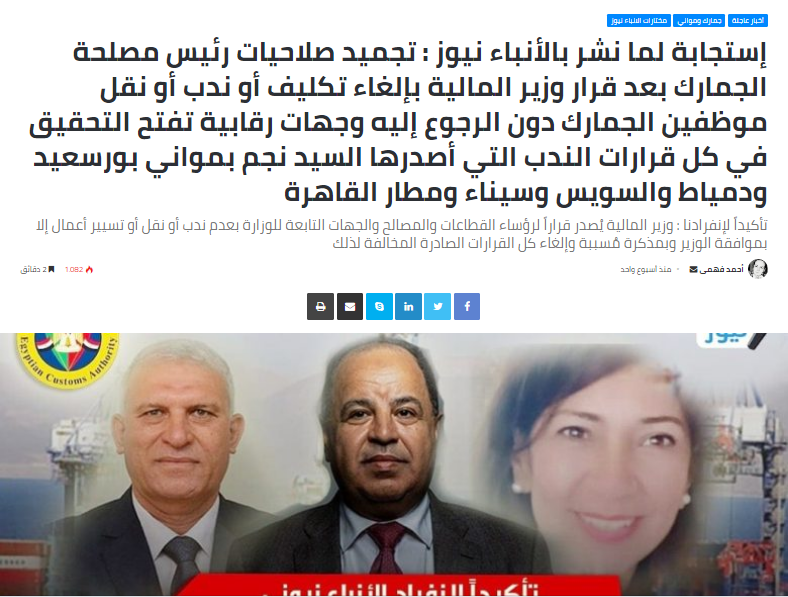 فرغم قراره المُسكن بتفويض الدكتورة منى ناصر مساعد وزير المالية لتطوير الجمارك إلا أنه مازال يحتفظ بالسيد نجم في موقعه كرئيس لمصلحة الجمارك رغم إنتهاء ندبه في 7 أغسطس الشهر الماضي ليُكمل القضاء على ما تبقى من الإدارات المركزية لمصلحة الجمارك ولله الأمر من قبل ومن بعد .. والملفات مفتوحة .