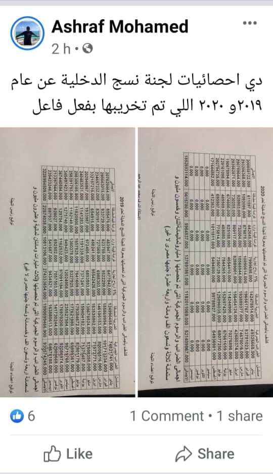 بينما كشف ((إجمالي الضرائب والرسوم الجمركية التى قامت بتحصيلها لجنة النُسج من شهر يناير وحتى نهاية شهر أغسطس السابق من العام الجاري 2020)) ورغم الآثار الإقتصادية المُترتبة على الإغلاق التام بالعالم بسبب جائحة كورونا كانت الإيرادات في ثمانية أشهر فقط من العام الحالي هي (((مليار وثمانمائة وإثنان وخمسون مليون وستمائة وثلاثة وتسعون ألف ومائة وأربعة عشرة جنيهاً))) أي ما يقرب من 2 مليار جنيه آخرين ورغم كل ذلك تم نقله بدون إبداء أي أسباب ولغرضٍ ما في نفس يعقوب .