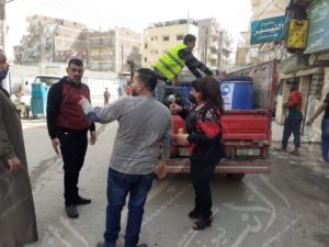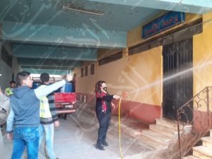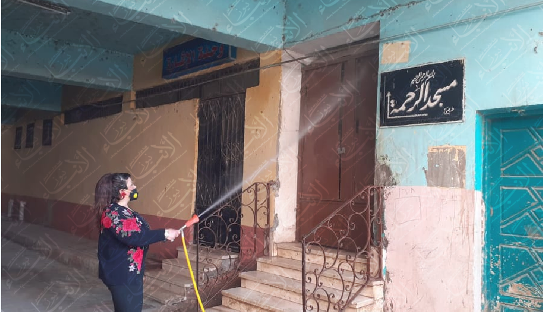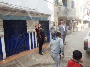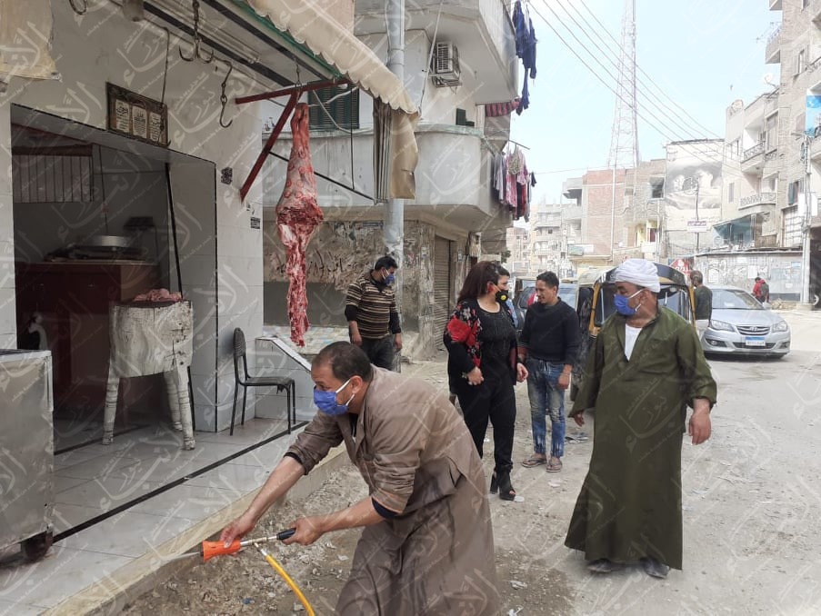 وقامت برش المساجد والمحال التجارية والمنازل والمنطقة بأكملها ,ووزعت الكمامات والقفازات على السيدات والرجال .