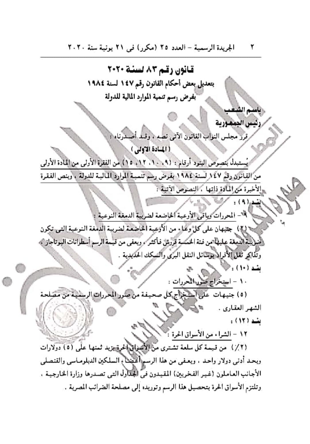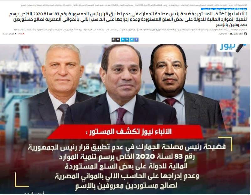 في الوقت الذي إنفردت فيه الأنباء نيوز بفضيحة عدم تطبيق قرار الرئيس عبد الفتاح السيسي رئيس الجمهورية رقم 83 لسنة 2020 والخاص بفرض رسوم تنمية على بعض السلع المستوردة والذي أحدث دويه بالرأي العام الجمركي فور نشره والذي تسائل خلاله الجميع لماذا لم يتم تطبيق القرار الجمهوري ولحساب من تم ذلك ؟