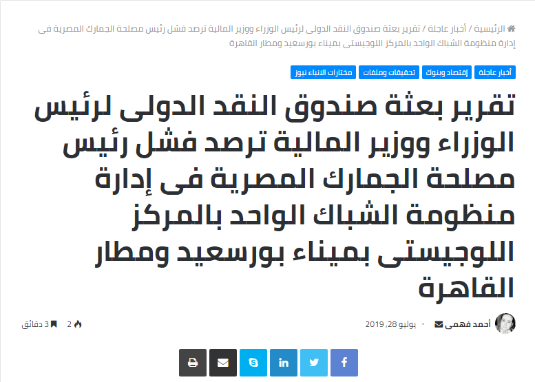 ناهيك عن أن كافة التقارير الجمركية التي تم تصعيدها لرئيس الوزراء والقيادة السياسية عن المراكز اللوجيستية بميناء بورسعيد ومطار القاهرة هيّ تقارير مُضللة وتحمل عرض غير أمين على قيادات الدولة ويشوبها العوار من حيث تقليل زمن الإفراج الذي وجه به الرئيس عبد الفتاح السيسي رئيس الجمهورية وشدد عليه في تصريحات صحفية والذي تواطىء من خلاله مسئولي الجمارك مع مسئولي شركة MTS الإمارتية ((بتوافق تام)) ومباركة وزير المالية فأصبح زمن الإفراج الألكترونى ((حسب تطوير رئيس مصلحة الجمارك ووزير المالية)) يستغرق وقت أطول من العمل بطريقة يدوية وهي من المُضحكات المُبكيات فى مصلحة الجمارك المنكوبة .