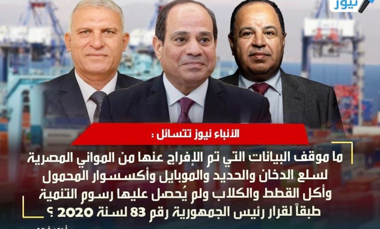 الأنباء نيوز تتسائل : ما موقف البيانات الجمركية التي تم الإفراج عنها من المواني المصرية لسلع الدُخان والحديد والموبايل وأكسسوار المحمول وأكل القطط والكلاب المستورد ولم يُحّصل عليها رسوم التنمية طبقاً لقرار رئيس الجمهورية رقم 83 لسنة 2020 ؟