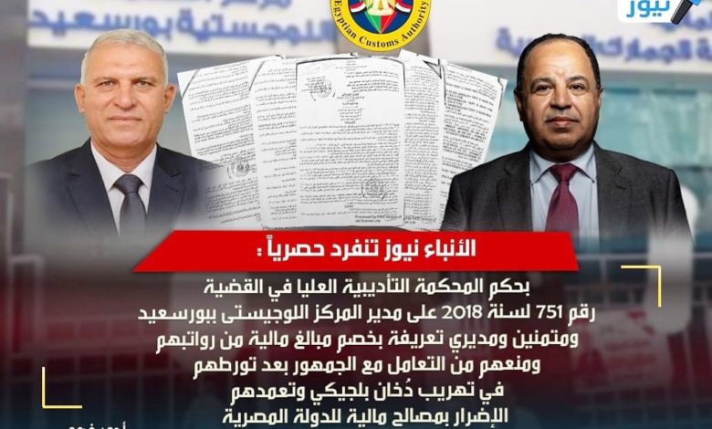 في فضيحة جديدة لمصلحة الجمارك المنكوبة تنفرد الأنباء نيوز حصرياً بنشر حكم المحكمة التأديبية العُليا في القضية رقم 751 لسنة 2018 على ((السمان إمبراطور لجنة الأسعار)) ومدير المركز اللوجيستى ببورسعيد ومتمنين ومديري تعريفة بخصم مبالغ مالية من رواتبهم ومنعهم من التعامل مع الجمهور بعد تورطهم في تهريب دُخان بلجيكي وتعمدهم الإضرار بمصالح مالية للدولة المصرية .