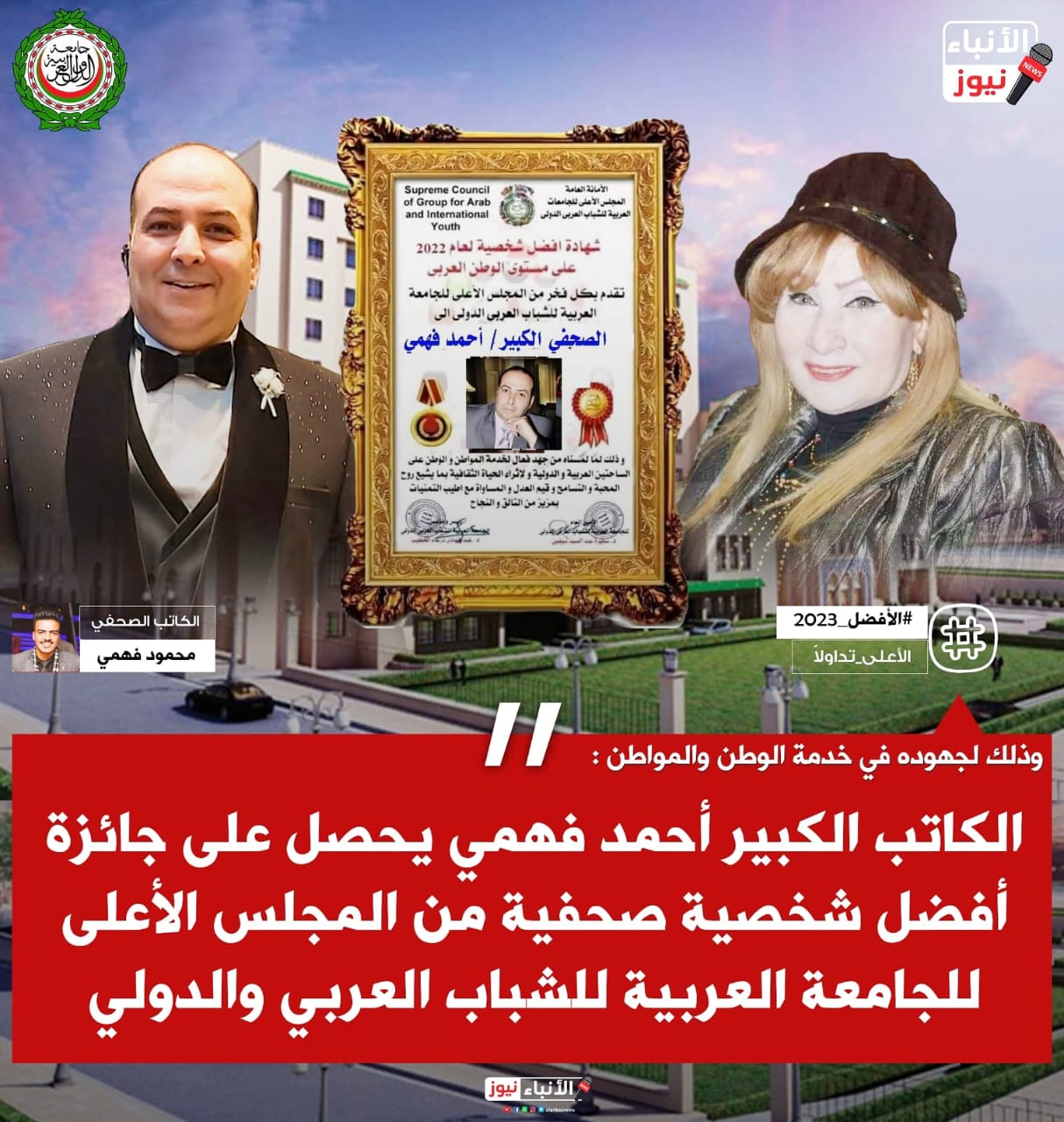 وذلك لجهوده في خدمة الوطن والمواطن : الكاتب الكبير أحمد فهمي يحصل على جائزة أفضل شخصية صحفية من المجلس الأعلى للجامعة العربية للشباب العربي والدولي