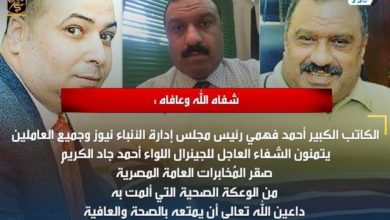 الأنباء نيوز تتتمنى الشفاء العاجل لـ اللواء أحمد جاد الكريم صقر المخابرات العامة المصرية