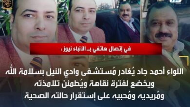 في إتصال هاتفي بـ الأنباء نيوز : اللواء أحمد جاد يُغادر مُستشفى وادي النيل بسلامة الله ويخضع لفترة نقاهة ويُطمئن تلامذته ومُريديه ومُحبيه على إستقرار حالته الصحية