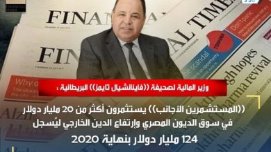 وزير المالية لصحيفة ((فاينانشيال تايمز)) البريطانية : ((المستشمرين الأجانب)) يستثمرون أكثر من 20 مليار دولار في سوق الديون المصري وإرتفاع الدين الخارجي ليُسجل 124 مليار دولار بنهاية 2020