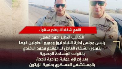 الأنباء نيوز تتمني الشفاء العاجل للمقدم محمد الأفندي بالقوات المسلحة المصرية بعد إجراؤه عملية جراحية ناجحة بالمنستشفى العسكري بحلمية الزيتون