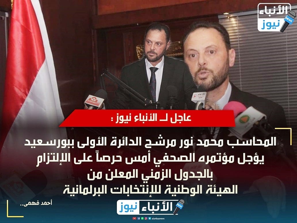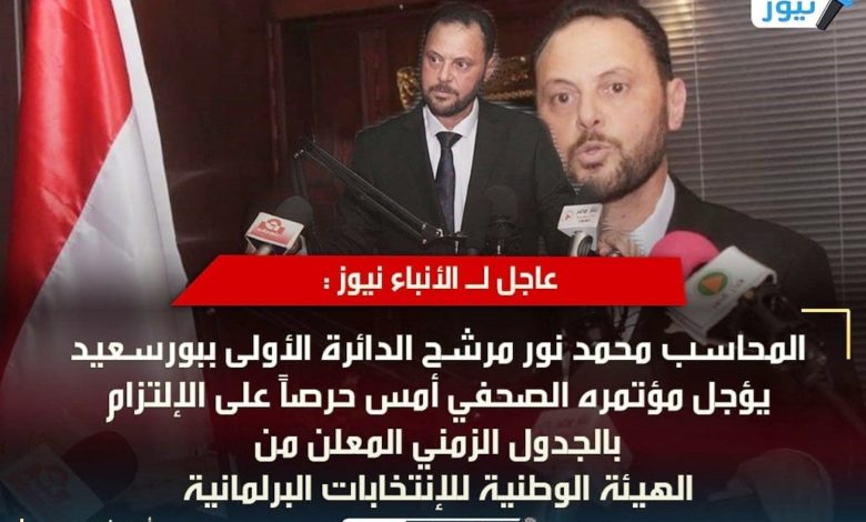 عاجل لـ الأنباء نيوز : المحاسب محمد نور مرشح الدائرة الأولى ببورسعيد يؤجل مؤتمره الصحفي أمس حرصاً على الإلتزام بالجدول الزمني المعلن من الهيئة الوطنية للإنتخابات البرلمانية