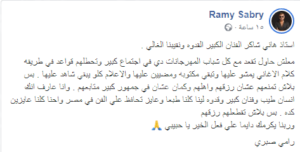 وبعد ذلك صرح المطرب (رامي صبري) عبر صفحته على الفيسبوك بدفاعه وإنتمائه لمطربين المهرجنات الشعبية بكل إحترام وتقدير وإنسانية مطالباً الفنان هاني شاكر بفكرة المصالحة الإلتزام بالقواعد اللغوية في الغناء الشعبي.