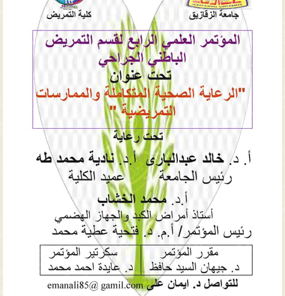 ينظم قسم التمريض الباطني الجراحي بكلية التمريض جامعة الزقازيق مؤتمر العلمي الرابع بعنوان “الرعاية الصحية المتكاملة والممارسات التمريضية ” بقاعة المؤتمرات بكلية التجارة تحت رعاية د. خالد عبد البارى رئيس الجامعة ، ود. محمد الخشاب أستاذ أمراض الكبد والجهاز الهضمي بكلية الطب . صرحت بذلك د. نادية محمد طه عميد الكلية مشيرة إلي أن المؤتمر يهدف إلي تكاتف الفريق الصحي لتحسين الرعاية الصحية الشاملة حيث يستهدف الأطباء والتمريض و الباحثين ومتخصصي الرعاية الصحية و طالب الدراسات العليا و الخريجين . وأضافت د. فتحية عطية محمد رئيس المؤتمر أن المؤتمر سوف يتناول ستة محاور: أسلوب التعامل المتكامل والممارسات التمريضية ، والرعاية الصحية والتمريضية عن بعد ، وإلا دارة الشاملة في الأزمات، والرعاية الصحية المعتدلة ، و التمريض التلطيفي والتأهيلى ، وجودة الحياة المرتبطة بالصحة.