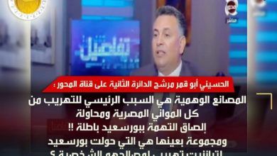 الحسيني أبو قمر مرشح الدائرة الثانية على قناة المحور : المصانع الوهمية هي السبب الرئيسي للتهريب من كل المواني المصرية ومحاولة إلصاق التهمة ببورسعيد باطلة !! ومجموعة بعينها هي التي حولت بورسعيد لترانزيت تهريبي لمصالحهم الشخصية !!