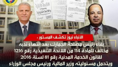 الأنباء نيوز تكشف المستور : بقاء رئيس مصلحة الجمارك بعد إنتهاء ندبه مخالف للمادة 114 من اللائحة التنفيذية رقم 1216 لقانون الخدمة المدنية رقم 81 لسنة 2016 ويتحمل مسئوليته وزير المالية ورئيس مجلس الوزراء