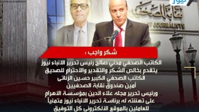 الكاتب الصحفي مدني صالح رئيس تحرير الانباء نيوز يتقدم بخالص الشكر والتقدير والاحترام للصديق الكاتب الصحفي الكبير حسين الزناتى أمين…